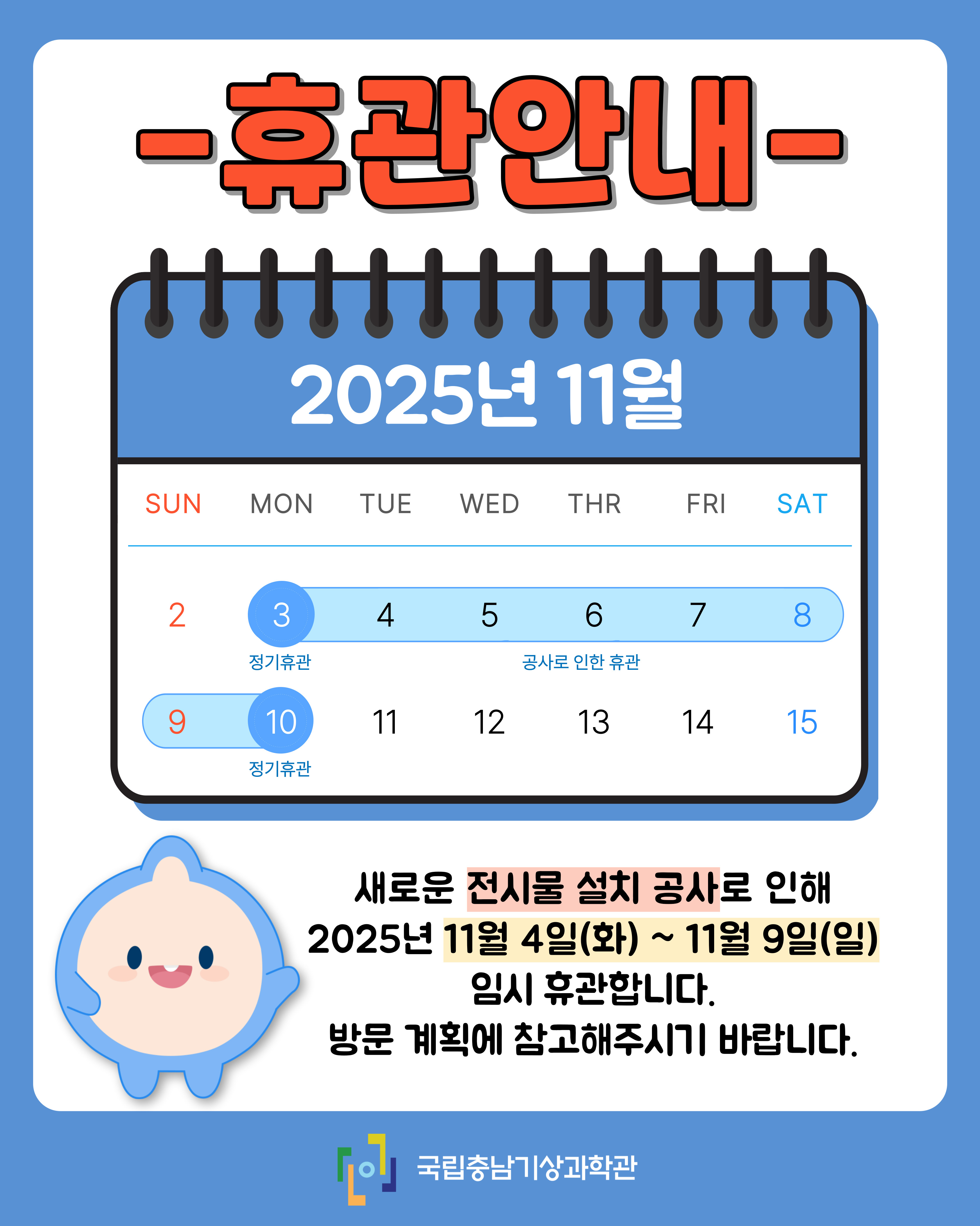 안녕하세요. 국립충남기상과학관입니다. 새로운 전시물 설치를 위한 공사로 과학관이 11월 4일(화)부터 11월 9일(일)까지 임시 휴관합니다. 관람에 불편을 드려 죄송하며, 더 나은 전시로 찾아뵙겠습니다.
