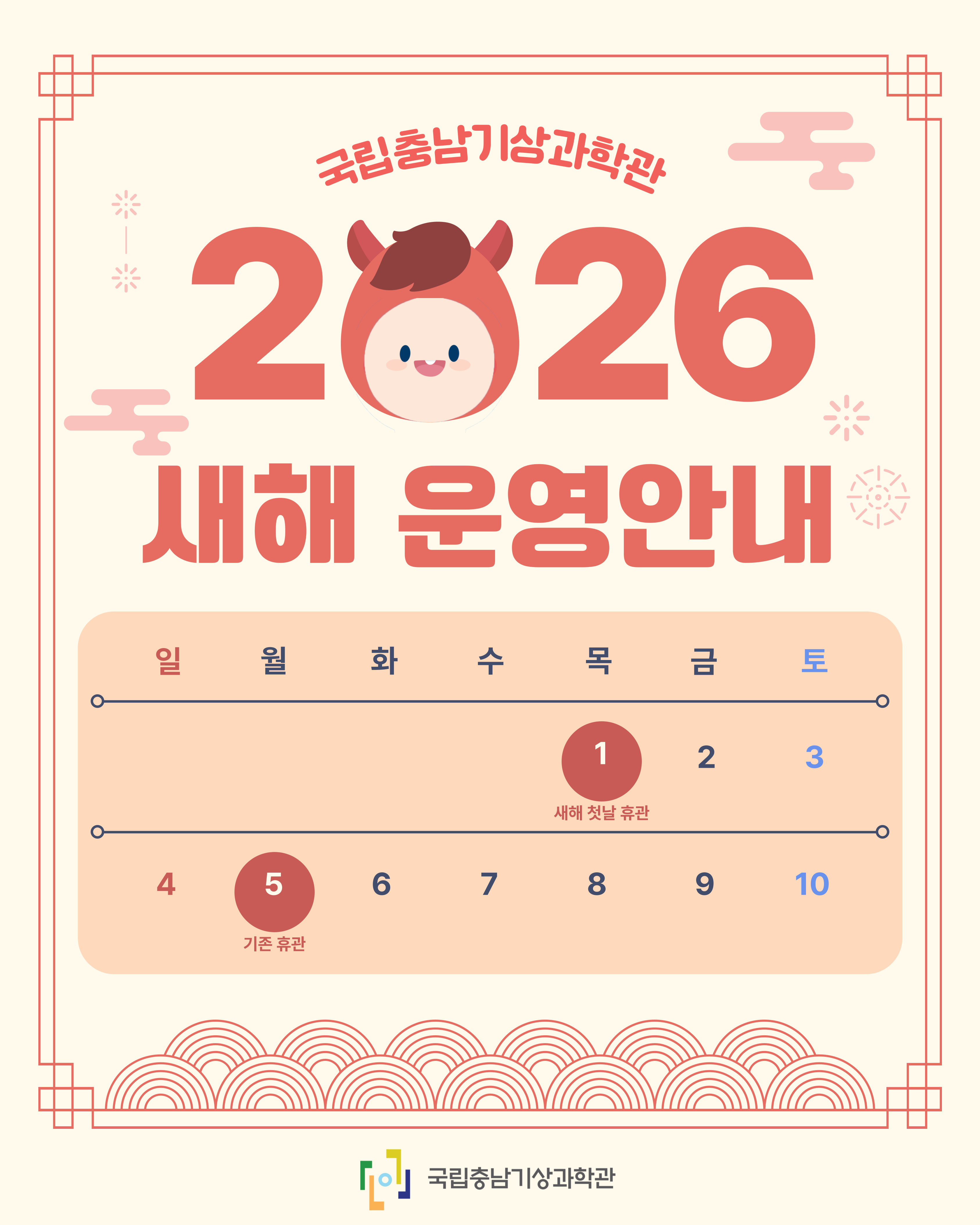 안녕하세요 국립충남기상과학관입니다! 새해 복 많이 받으세요 2026년에도 건강하고 행복한 한 해 되시길 바랍니다 과학관 휴관 안내드립니다. 국립충남기상과학관은 2026년 1월 1일(목) 신정으로 인해 휴관합니다. 방문에 참고 부탁드리며, 새해에도 많은 관심과 방문 부탁드립니다 감사합니다