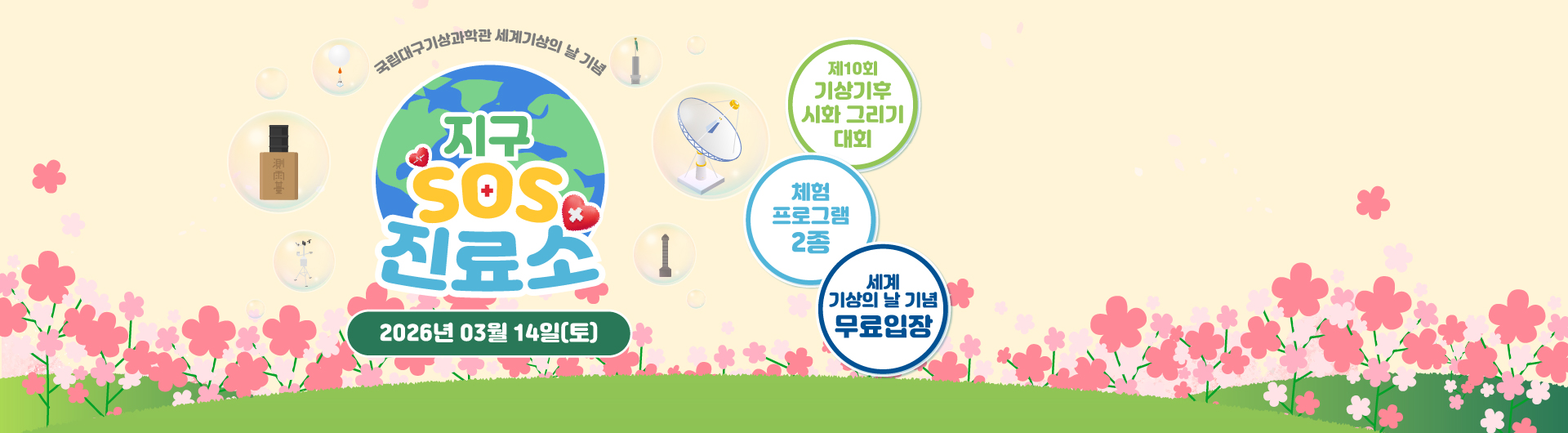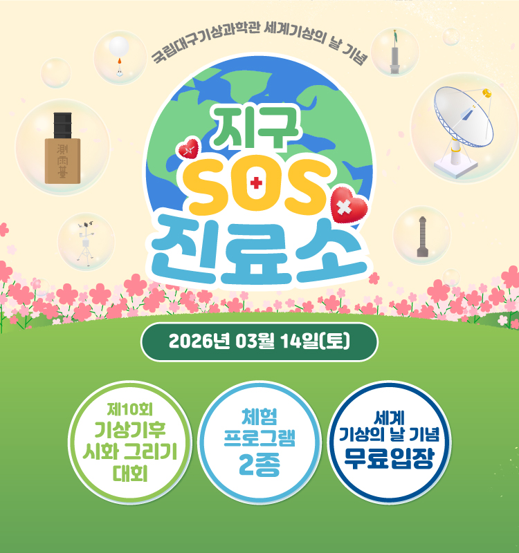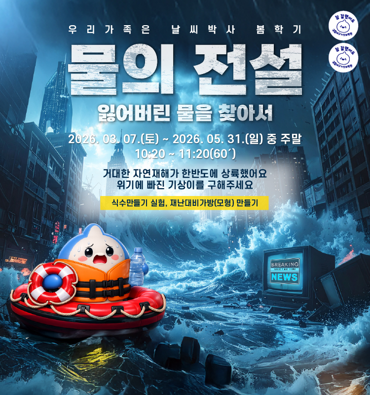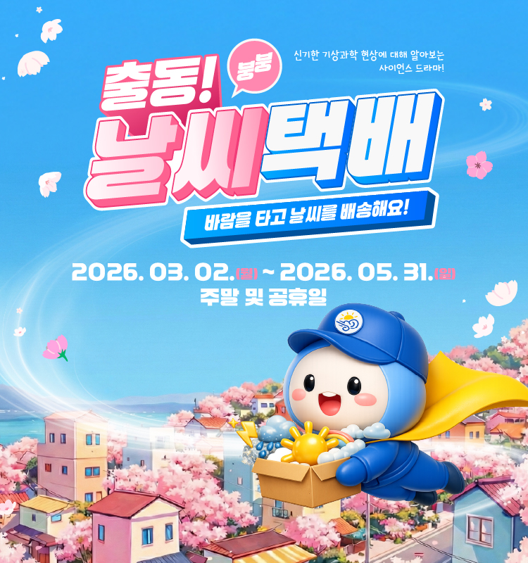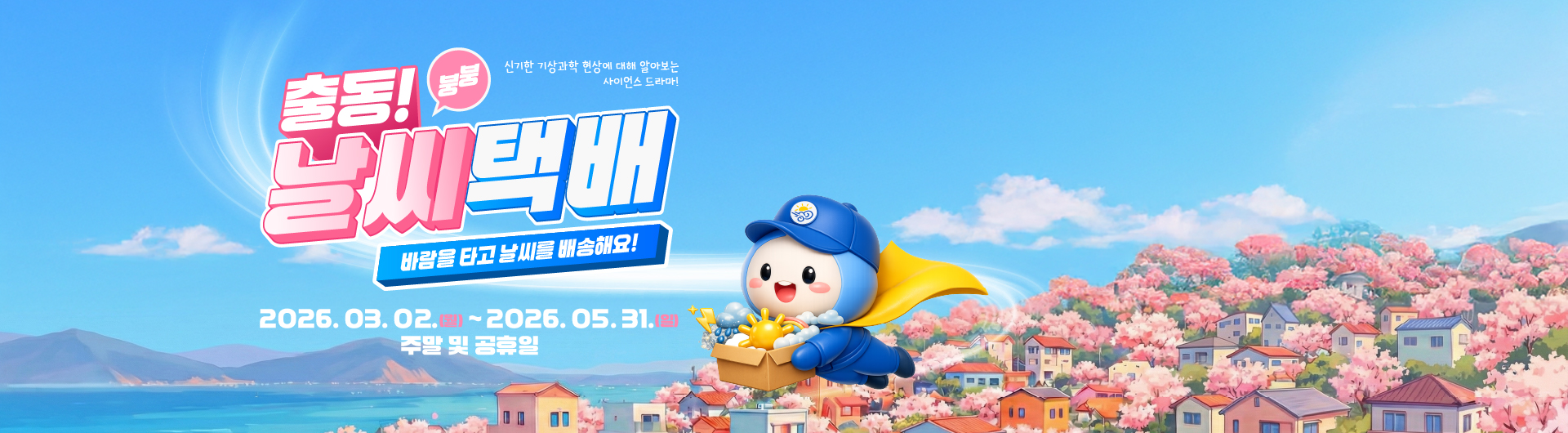 FOLLOW US 관람안내 전시안내 교육안내 Q&A 찾아오는길 문의사항 공지사항 더보기 국립대구기상과학관 전시해설사(육아휴직대체) 채용 2026-01-18 국립대구기상과학관 운영 체험교사(육아휴직대체) 채용 2026-01-18 4D영상관 상영작 변경 안내 2026-01-03 문화행사 더보기 2026년 세계기상의 날 기념 [지구 SOS 진료소] 2026-02-28 국립대구기상과학관 3월 일정 안내 2026-02-27 국립대구기상과학관 3월 단체프로그램 일정 안내 2026-02-27