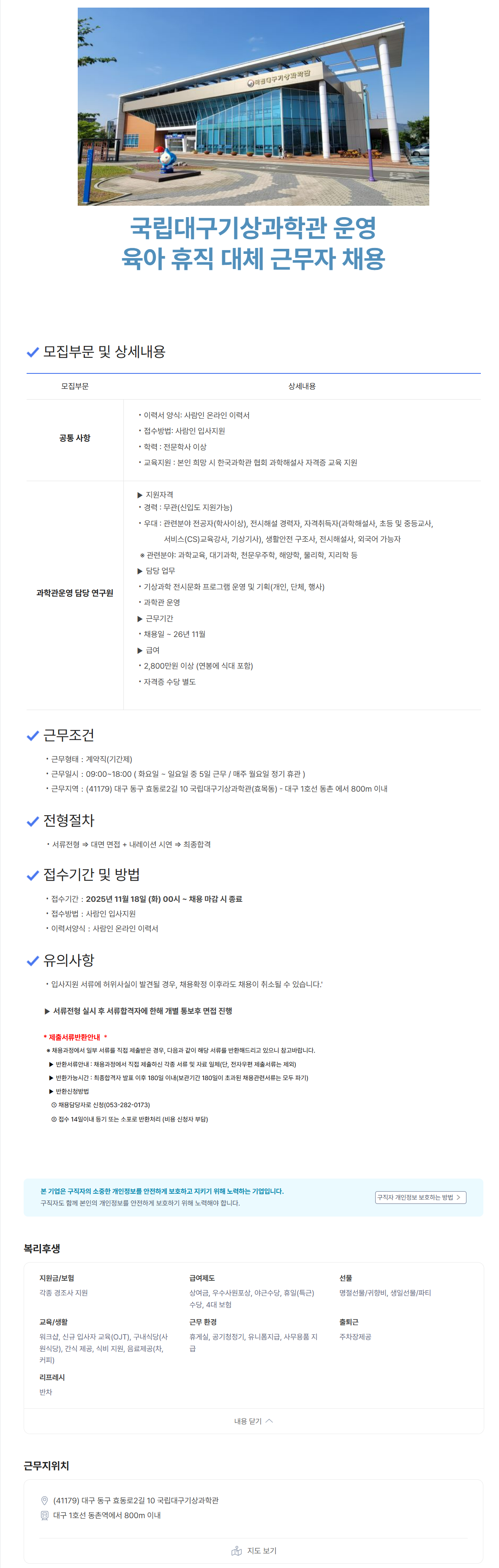 국립대구기상과학관 운영 육아휴직 대체 근무자 채용