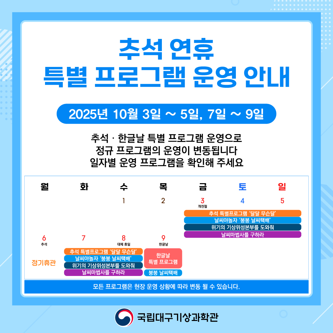 추석 연휴 특별 프로그램 운영 안내 (2025. 10. 3.~5. / 10. 7.~9.)