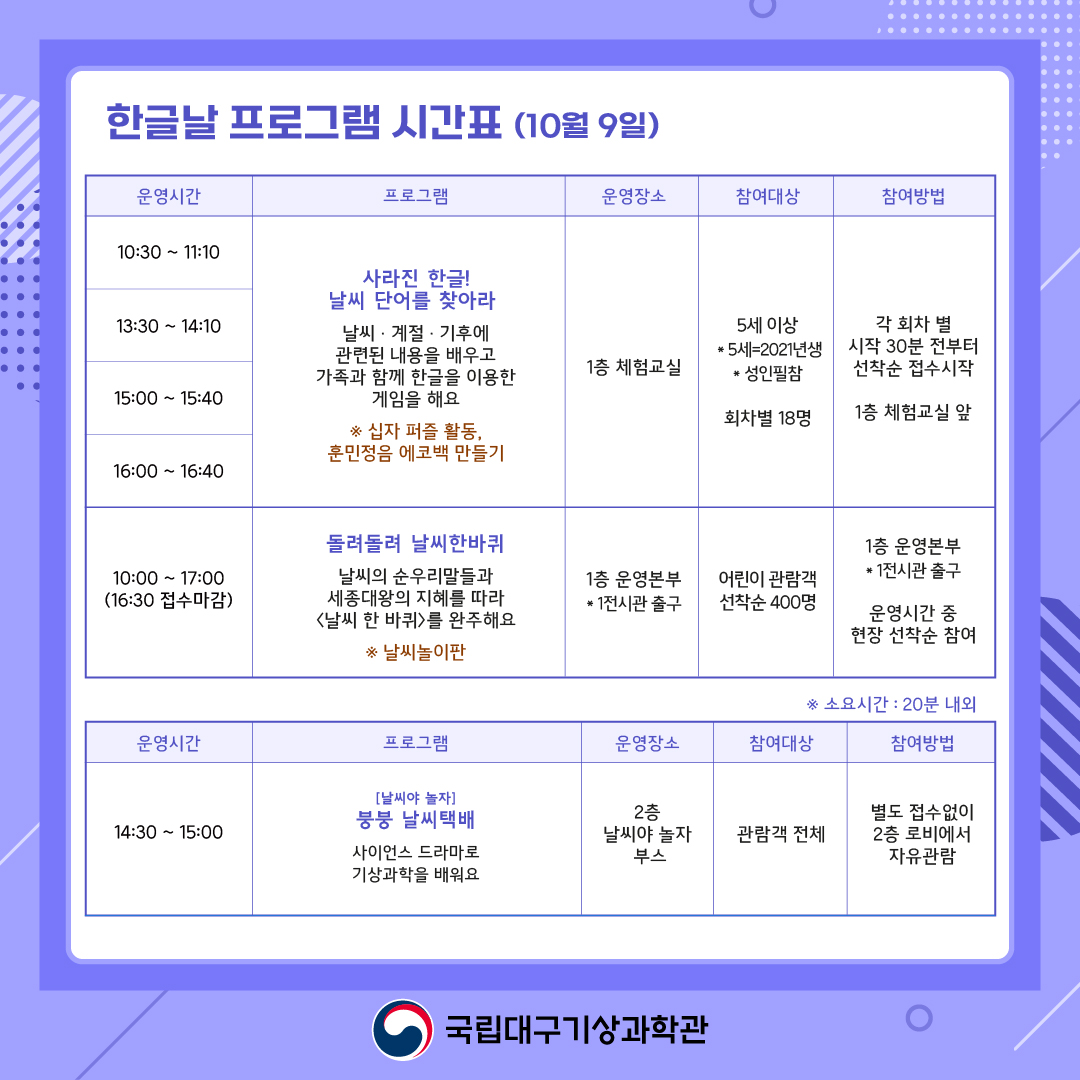 · 한글날 특별 프로그램 '사라진 한글 - 날씨 단어를 찾아라','돌려돌려 날씨 한 바퀴' (10. 9.)