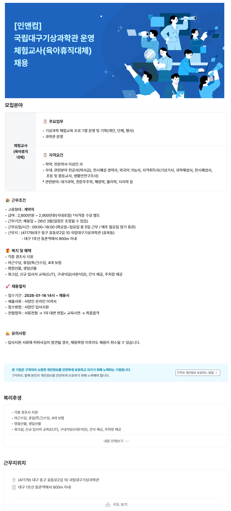 국립대구기상과학관 운영 체험교사(육아휴직대체) 채용