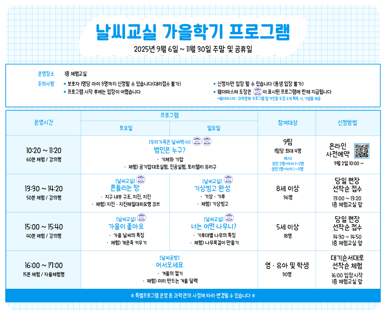 국립대구기상과학관의 사정에 따라 별도의 공지 없이 체험프로그램이 변동될 수 있습니다.