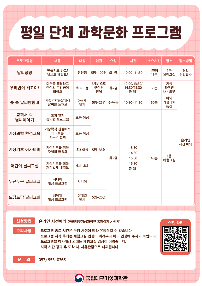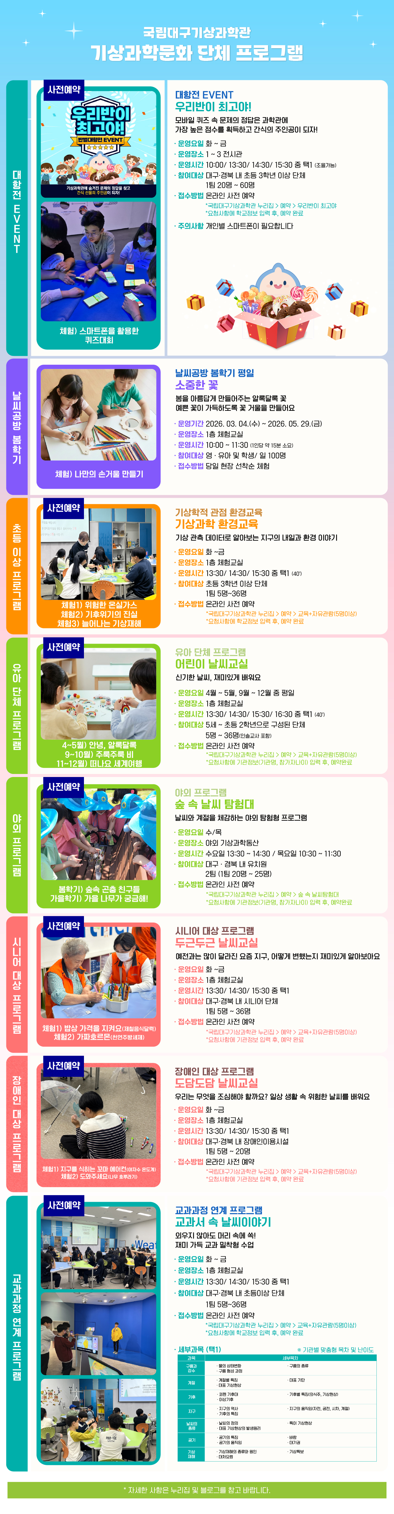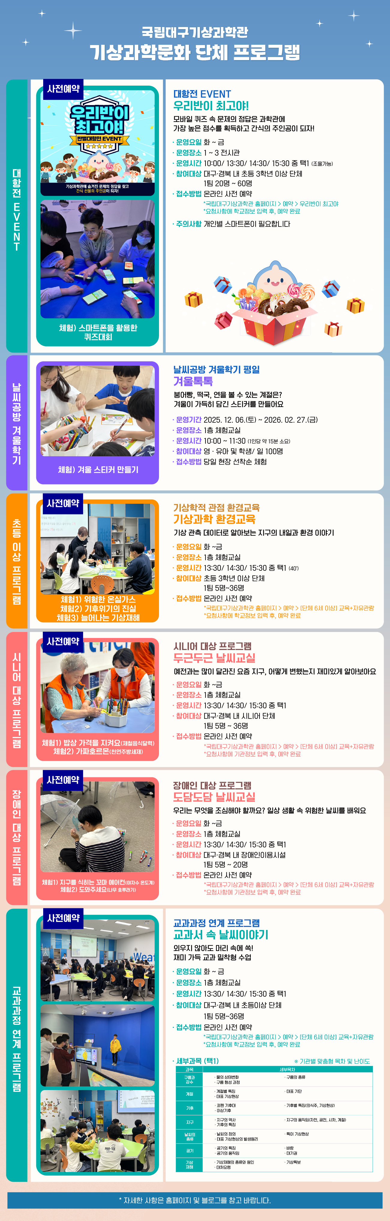 국립대구기상과학관의 사정에 따라 단체교육이 불가할 수 있습니다.