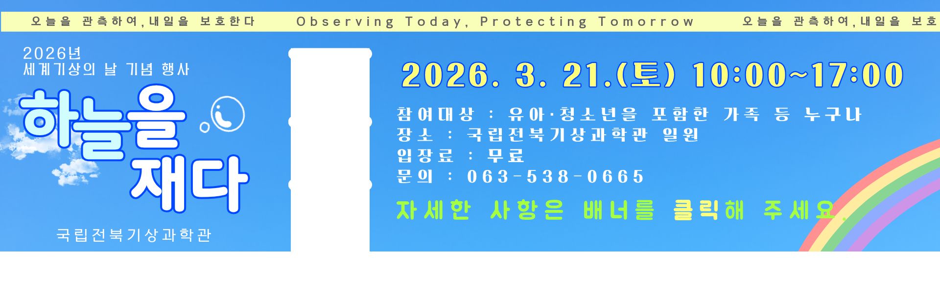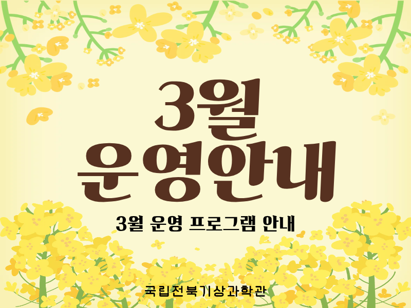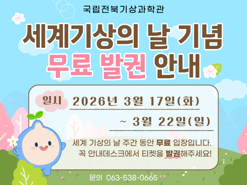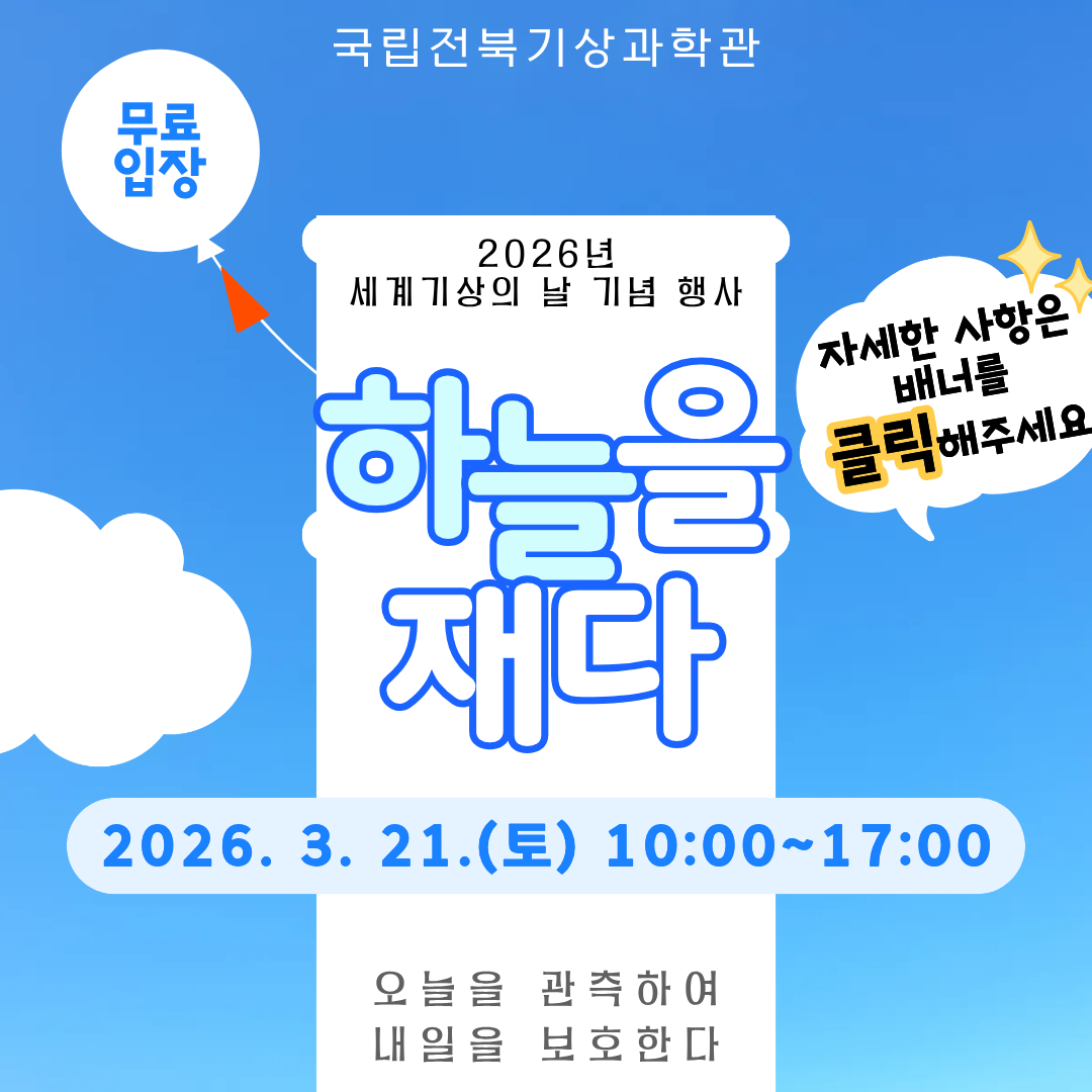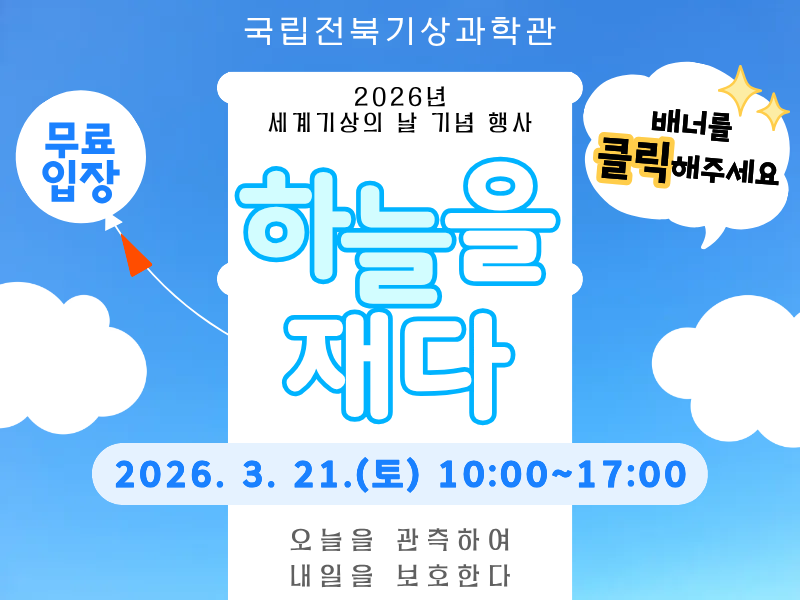 세계기상의 날을 맞아 과학관을 무료로 개방합니다! ○ 무료 관람 기간 : 2026년 3월 17일(화) ~ 3월 22일(일) ○ 관람료 : 무료 (기간 내 누구나 자유롭게 입장 가능) ★ 3월 21일(토) - 세계기상의 날 기념 행사 '하늘을 재다' 개최! ★ 다양한 체험 프로그램들이 준비되어 있으니, 많은 관심과 참여 부탁드립니다! 자세한 사항은 링크를 확인해주세요! 감사합니다.