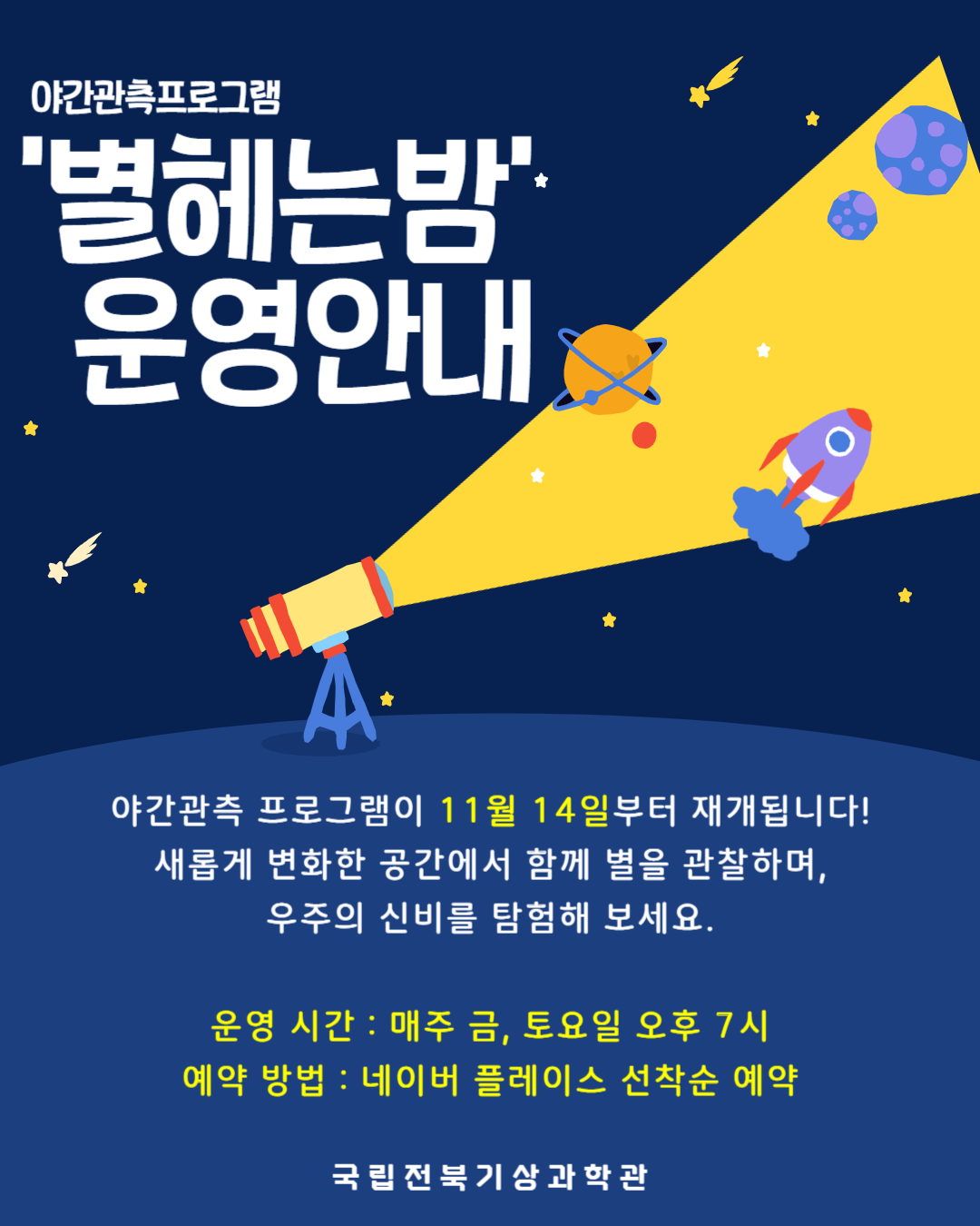과학1관이 리모델링을 마치고 11월 14일부터 야간관측 프로그램 '별헤는밤' 운영이 재개됩니다.