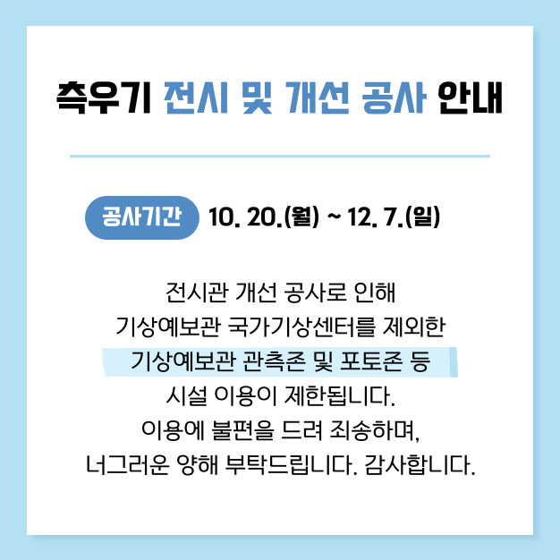 2025.10 15공지사항 측우기 전시 및 개선 공사로 인한 일부 시설 이용 제한 안내(10. 20. ~ 12. 7.) 자세히보기 >