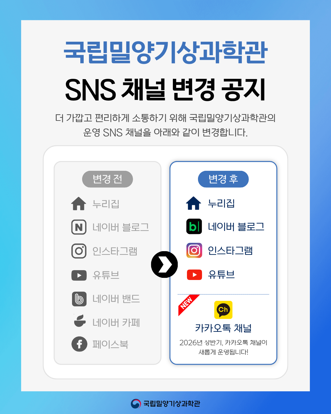 2026년, 더 가깝고 편리하게 소통하기 위해 국립밀양기상과학관의 운영 SNS 채널을 아래와 같이 변경합니다. 감사합니다.