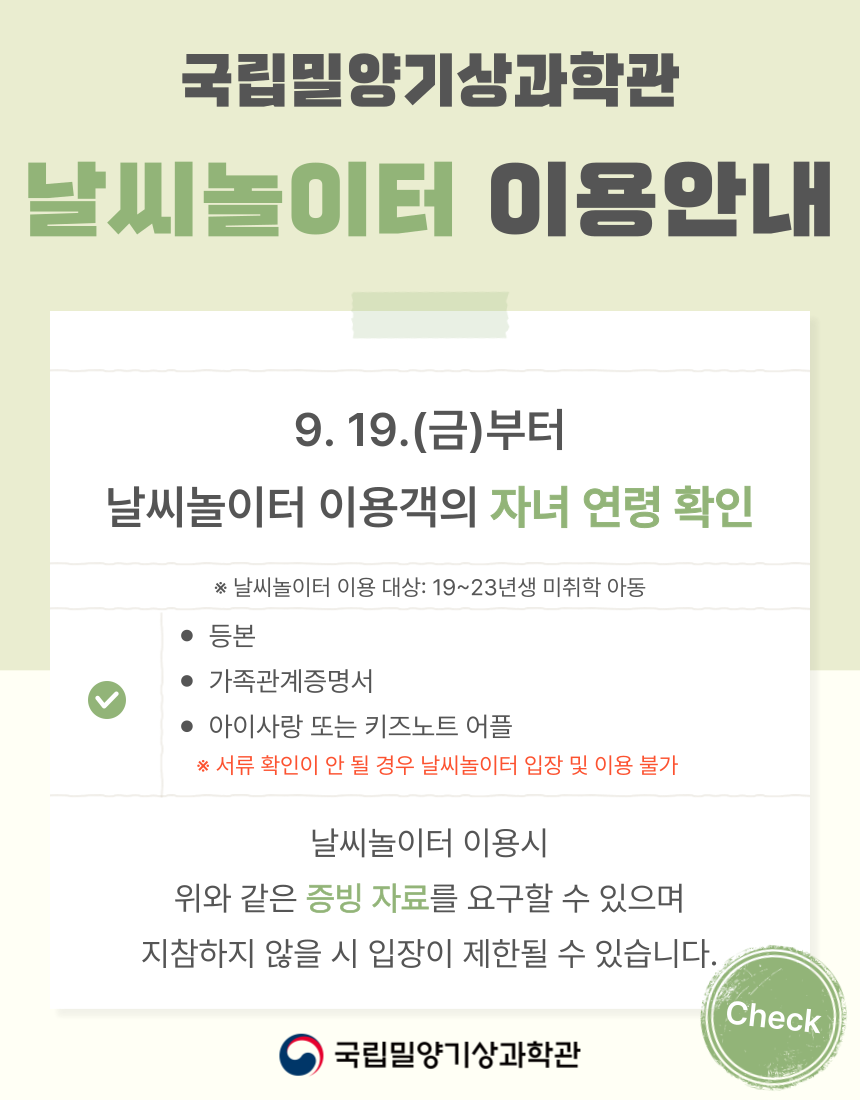 9월 19일(금)부터 국립밀양기상과학관 날씨놀이터 이용객의 자녀 연령을 확인합니다.