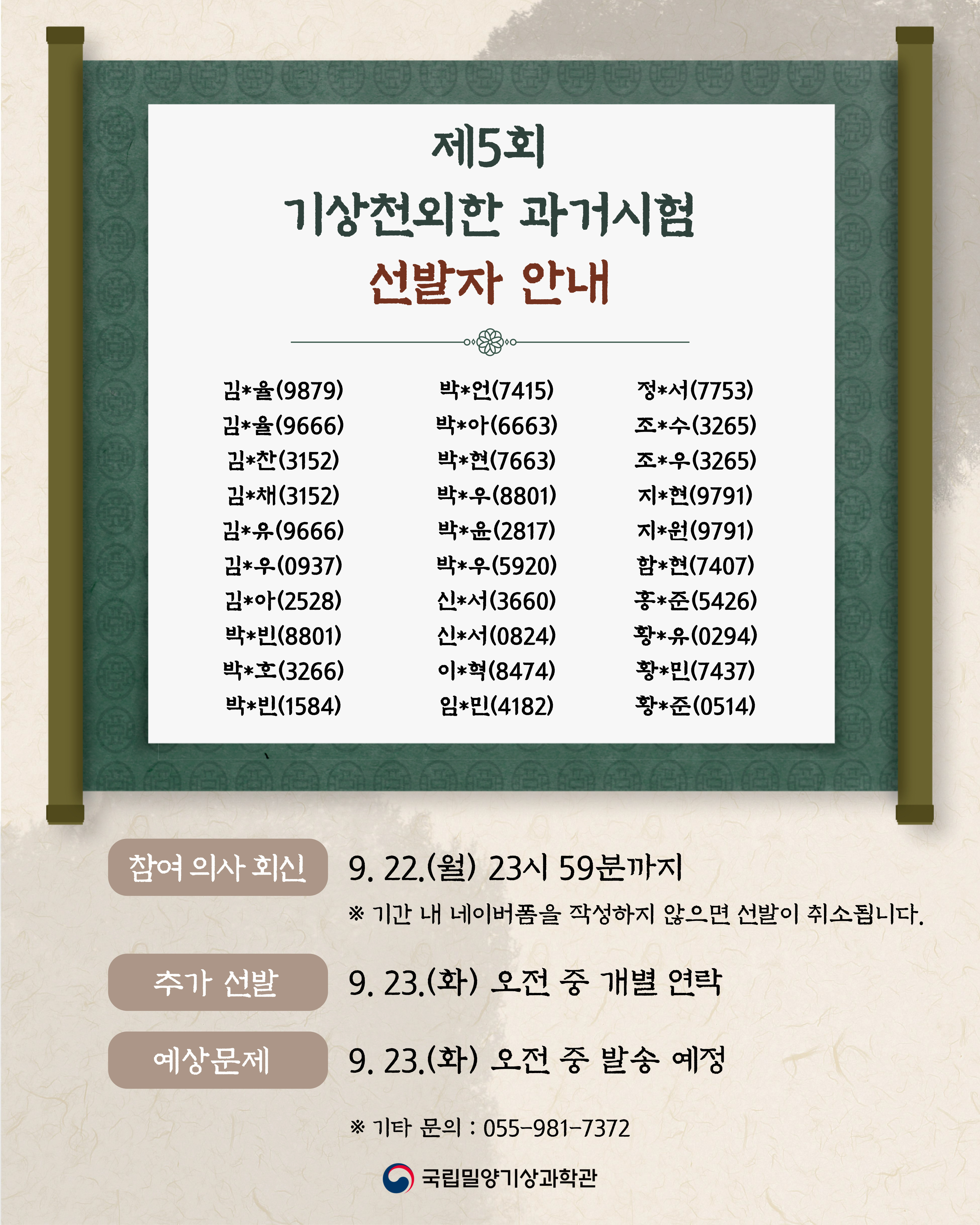 9월 28일 진행되는 <제5회 기상천외한 과거시험> 선발 확정에 대해 안내드립니다.