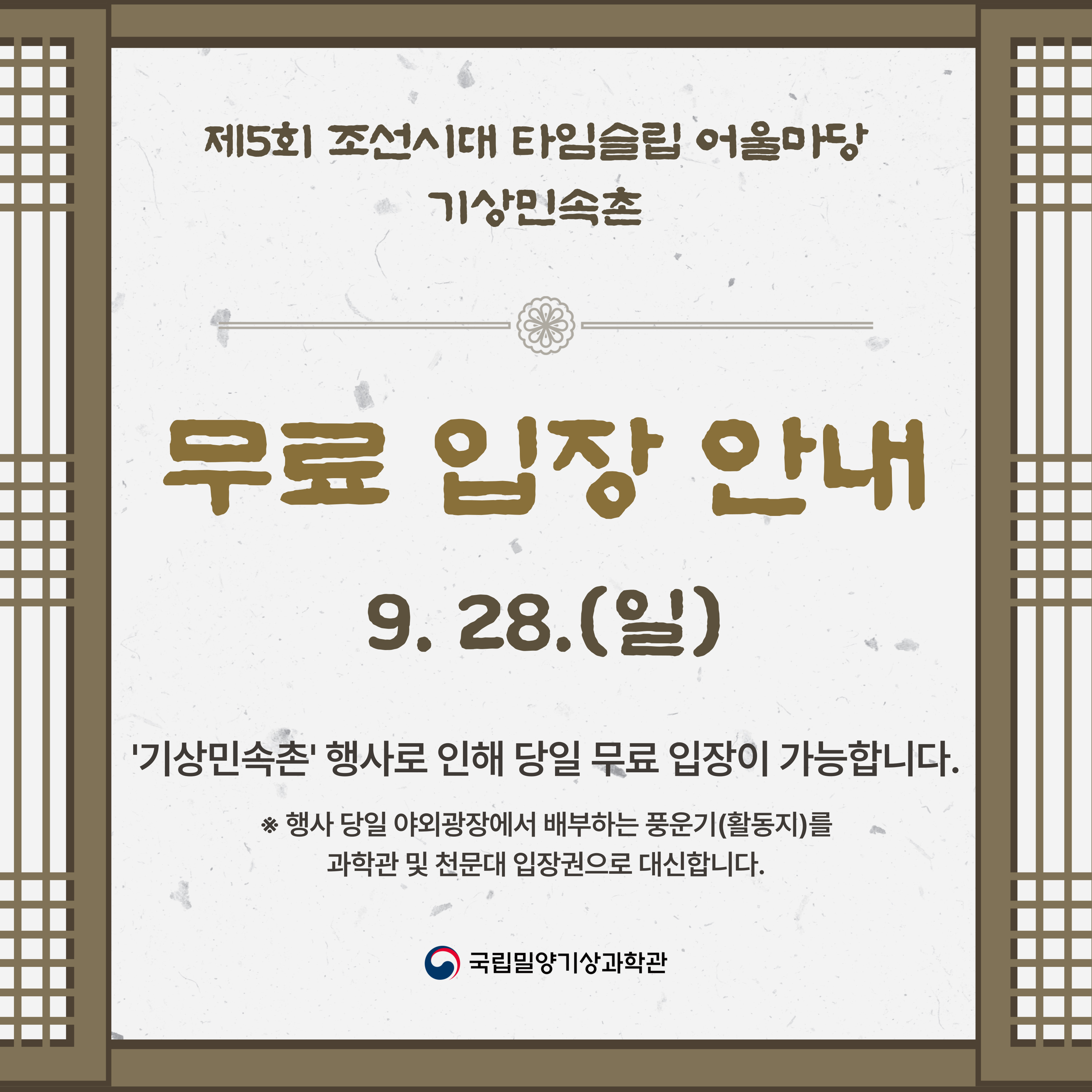 9월 28일 진행되는 '기상민속촌' 행사로 인해 당일 무료 입장이 되니 관람에 참고바랍니다.