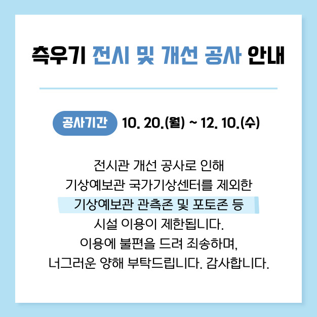 10월 20일(월)부터 12월 10일(수)까지 전시관 개선 공사로 인해 기상예보관 국가기상센터 체험관을 제외한 기상예보관 관측존 및 포토존 등 일부 시설 이용이 제한됩니다.