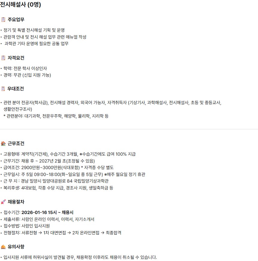 [채용마감] 국립밀양기상과학관 전시해설사(육아휴직대체근로자) 채용