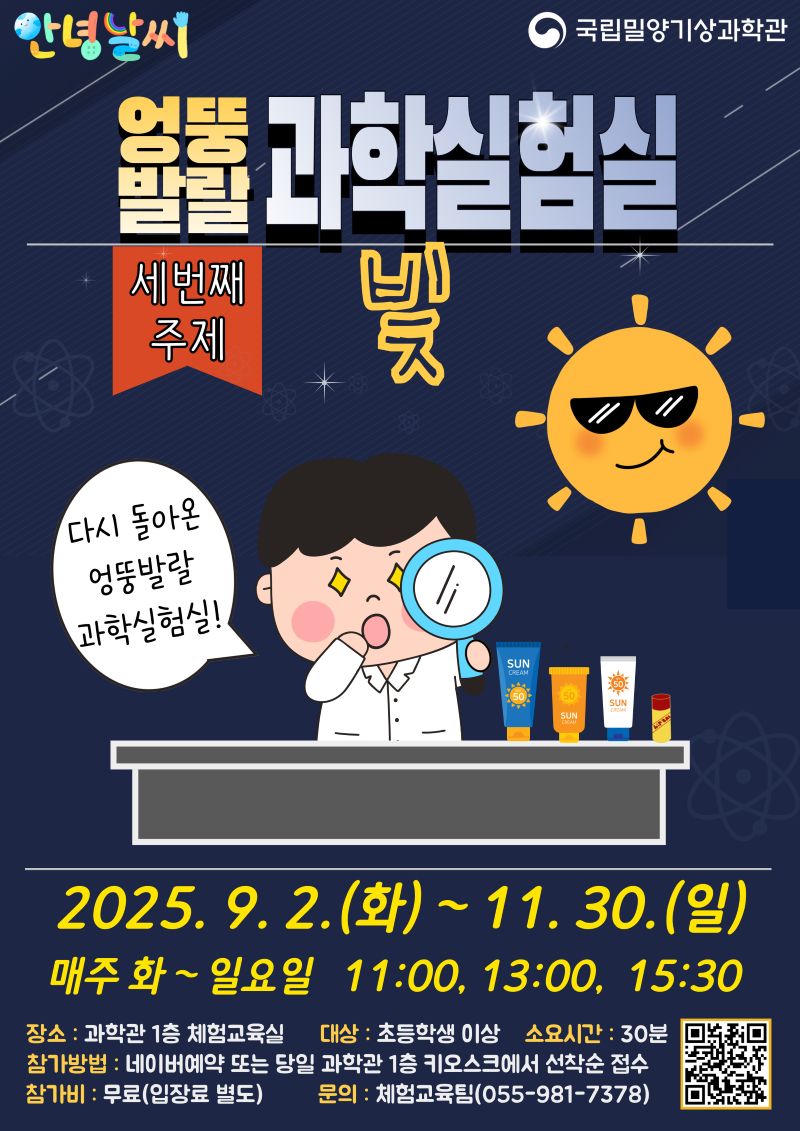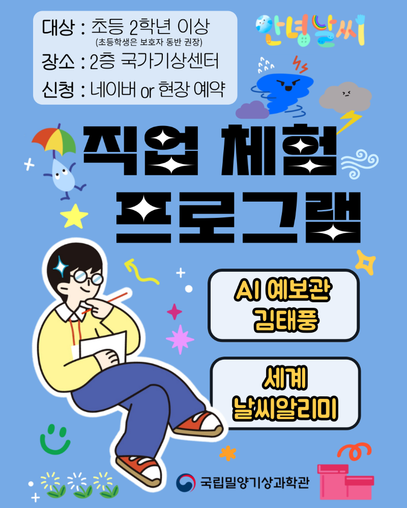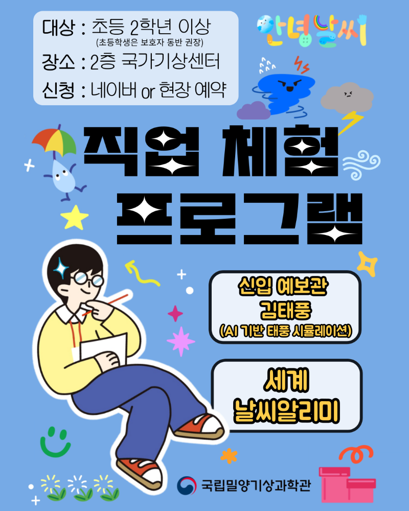 어려운 기상과학의 원리를 과학실험, 놀이형 체험 등으로 재미있게 학습하는 국립밀양기상과학관 체험교육 브랜드입니다.