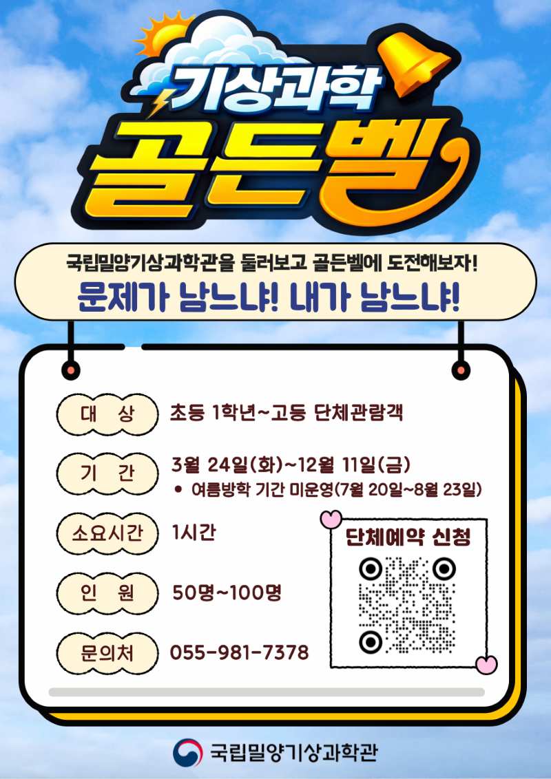 어려운 기상과학의 원리를 과학실험, 놀이형 체험 등으로 재미있게 학습하는 국립밀양기상과학관 체험교육 브랜드입니다.
