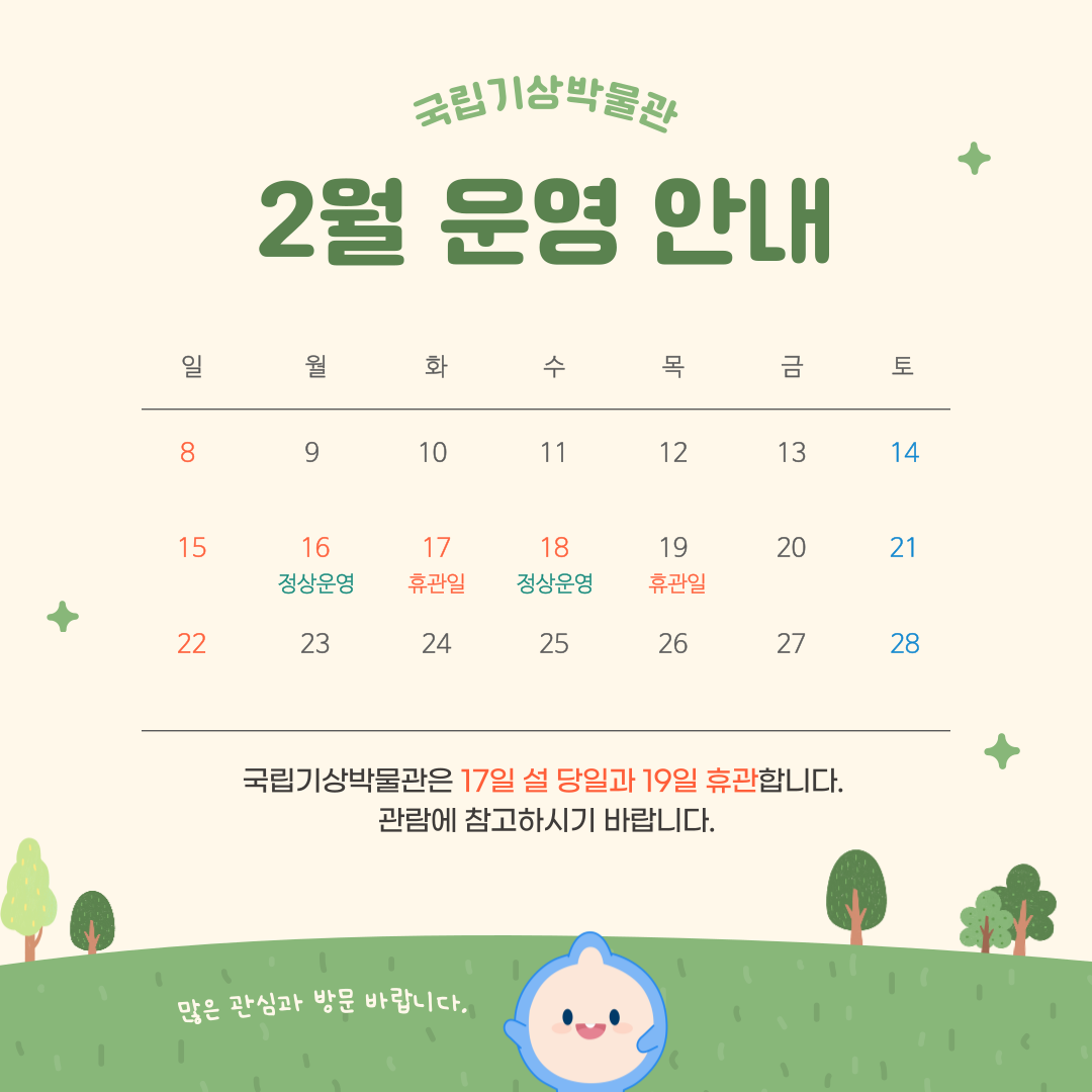 국립기상박물관은 17일(화) 설 당일과 19일(목) 휴관합니다.