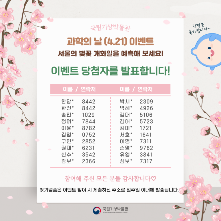 서울의 벚꽃 개화일을 예측해보는 이번 이벤트에 많은 관심과 참여보내주셔서 진심으로 감사드립니다.