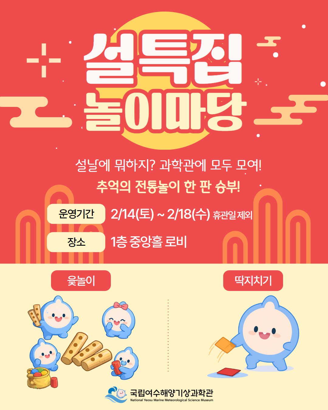 국립여수해양기상과학관에서는 설 연휴를 맞아 전통놀이 체험 프로그램 [설특집 놀이마당] 을 운영합니다.
