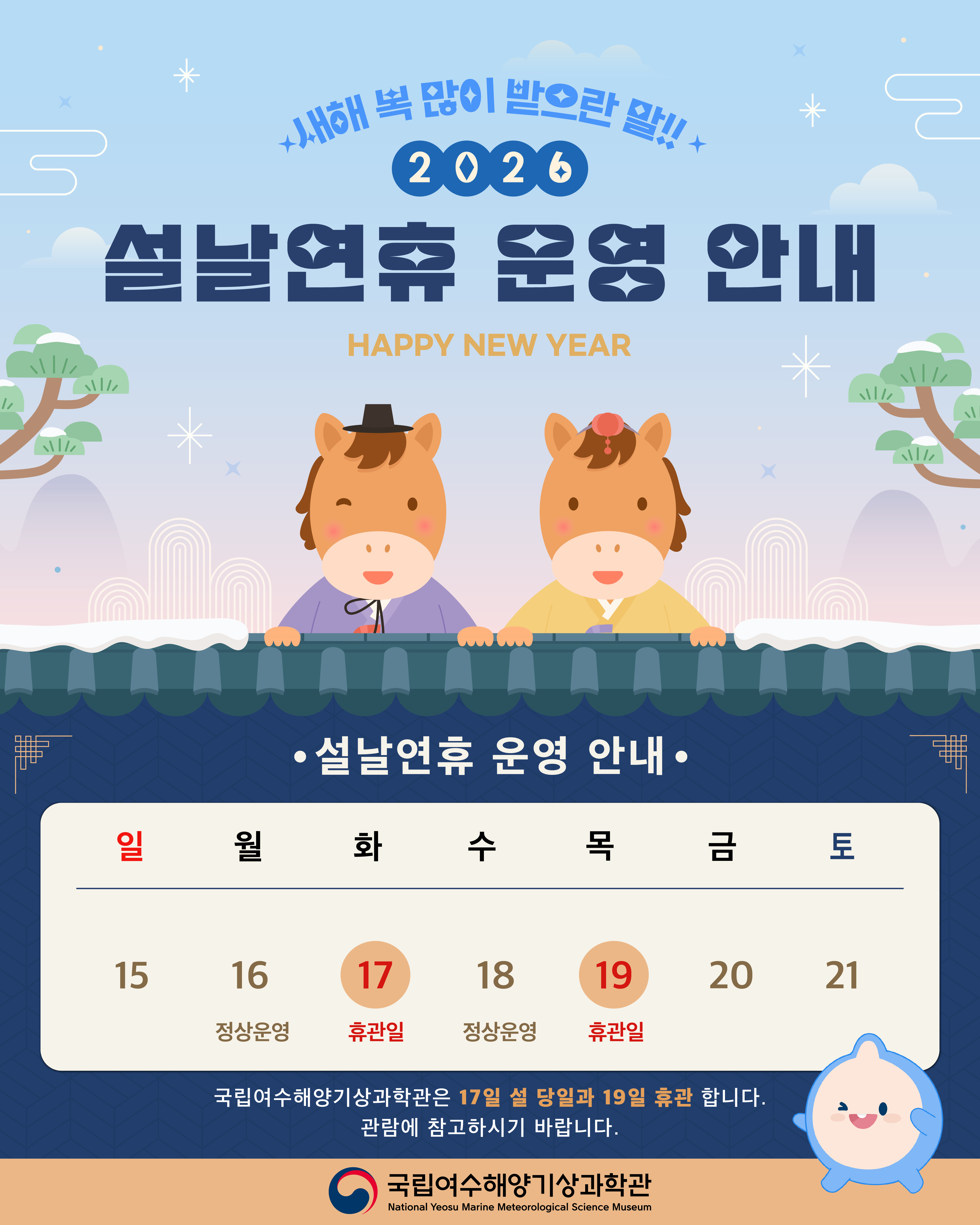 국립여수해양기상과학관은 17일(화) 설 당일과 19일(목) 휴관합니다.